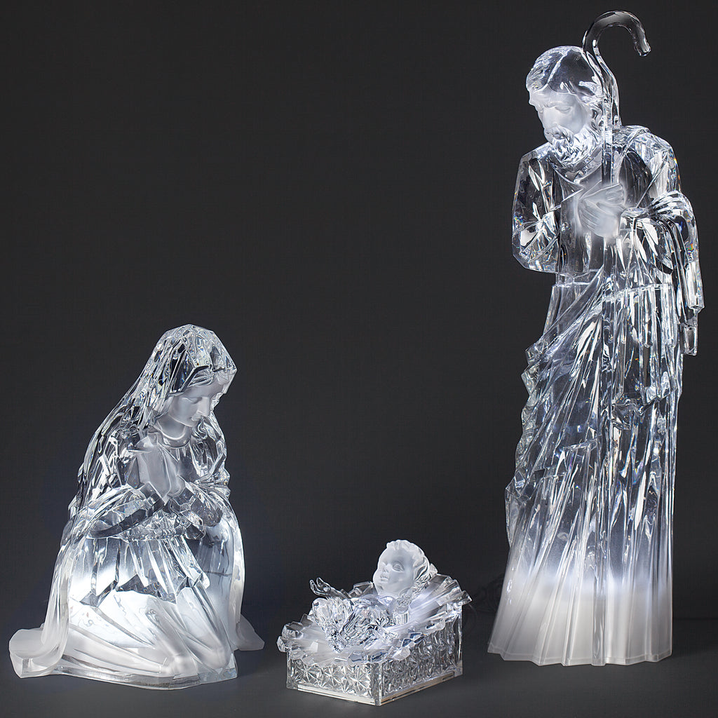 Create a stunning focal point for your holiday decor with this elegant lighted Holy Family set. This three-piece acrylic display includes illuminated figures of Mary, Joseph, and baby Jesus in exquisite detail. The soft internal glow enhances their peaceful presence, making it a beautiful and meaningful centerpiece for mantels, entryways, or under the tree.