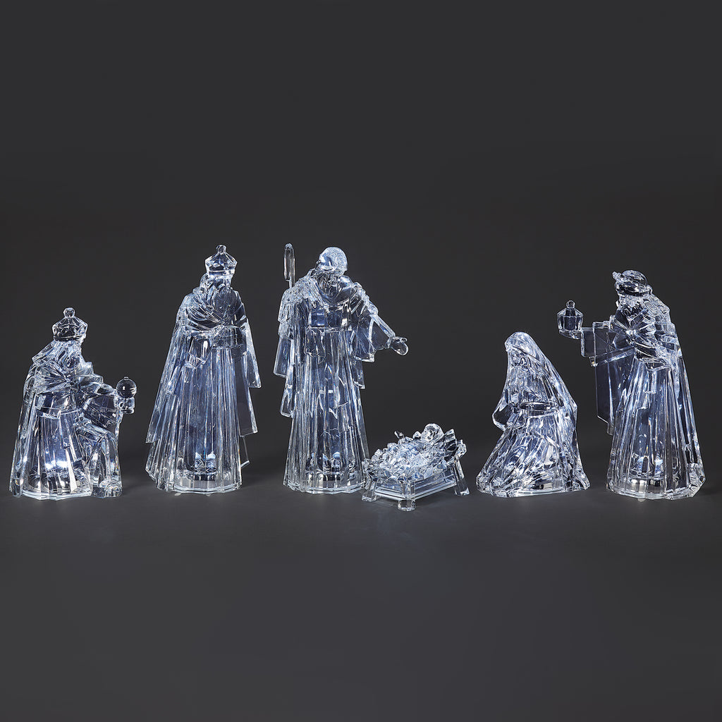 Celebrate the birth of Christ with brilliance and beauty using this lighted nativity set. The set includes the Holy Family and Three Kings, each illuminated with cool light for a serene and elegant glow. Perfect for tabletops, mantels, or entryways.