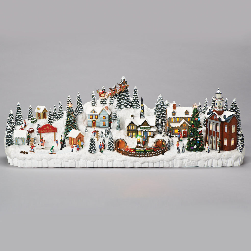 Transform your home into a winter wonderland with this enchanting Christmas Village scene. Snow-covered houses and shops glow with warm light while festive carols play, filling the air with holiday cheer. A colorful train winds its way through the village, bringing delightful movement to the display as villagers skate, shop, and celebrate the season. Full of charm and detail, this lighted and musical centerpiece is a captivating way to bring the magic of Christmas to life. Skaters rotate on pond.
