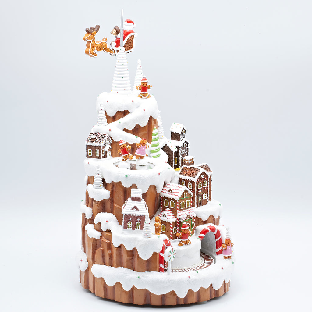 This enchanting gingerbread mountain is alive with holiday magic, featuring frosted rooftops, candy-cane details, and gingerbread figures tucked into every tier. Santa’s sleigh circles high above while a gingerbread train winds its way around the snowy base, both rotating in motion as cheerful music and glowing lights complete the scene. With its movement, lighted details, and gingerbread charm, this piece is a captivating centerpiece that brings the wonder of Christmas to life.