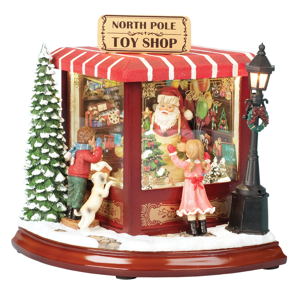 Step into the wonder of Christmas with this enchanting North Pole Toy Shop. Children press their noses to the glowing windows, gazing at Santa surrounded by shelves of toys and holiday treasures. The shop is decorated with striped awnings, wreaths, and snow-covered trees, while a classic lamp post adds warm charm to the scene. Perfect as part of a holiday village or as a standalone centerpiece, this illuminated shop captures the joy and anticipation of Christmas morning.