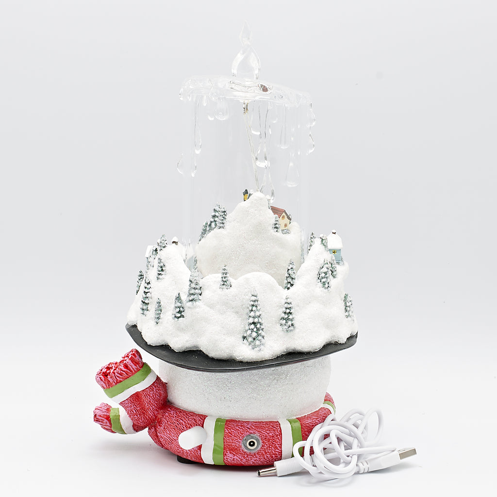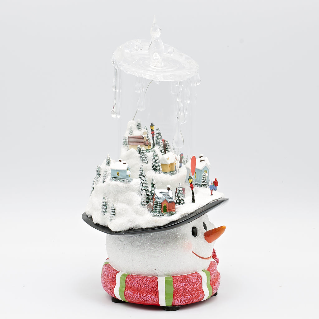 This intricately crafted lighted snowman features a charming village scene that gently rotates atop his hat, creating a captivating focal point. The scene is illuminated, casting a warm glow and enhancing the whimsical motion. This playful piece adds joy, sound, and festive flair to mantels, shelves, or tabletops, making it a delightful addition to your holiday decor.