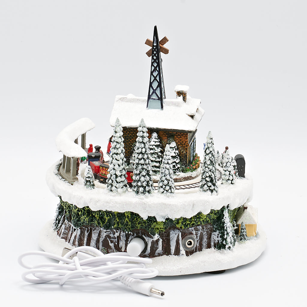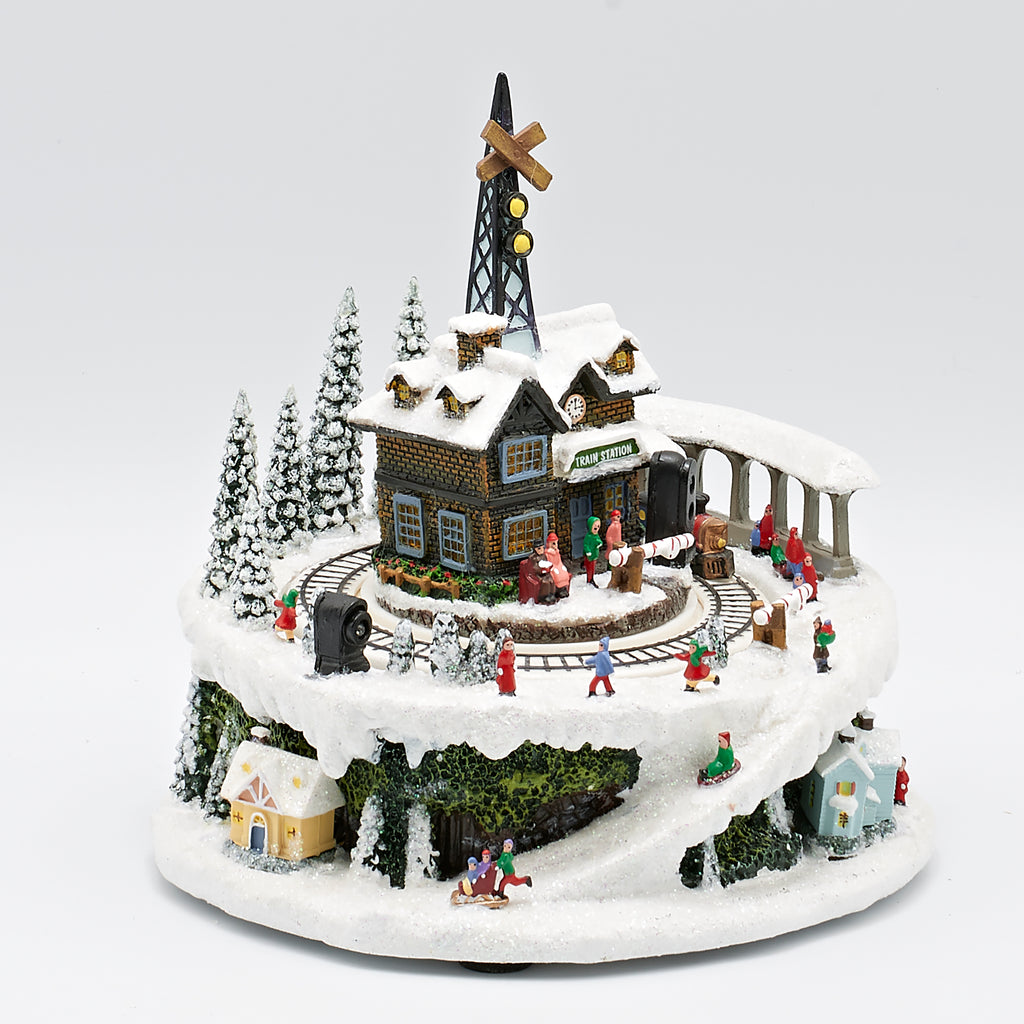 Step into a festive winter wonderland with this animated Christmas train station. A snowy station house sits at the center, surrounded by pine trees, villagers, and holiday activity. At the base, a cheerful train circles the tracks, while children play and sled down the snowy hillside. With glowing lights and delightful detail, this piece captures the magic of a bustling holiday village. Perfect as a centerpiece or gift, it’s a keepsake that brings warmth, movement, and nostalgia to your Christmas decor.