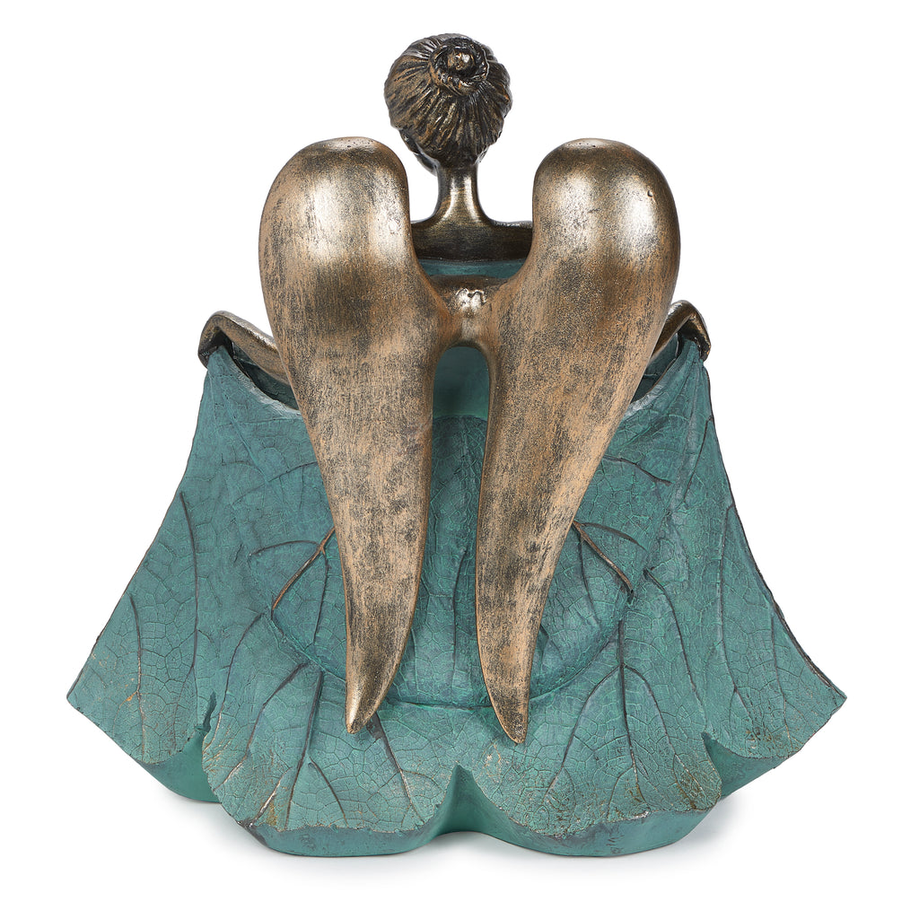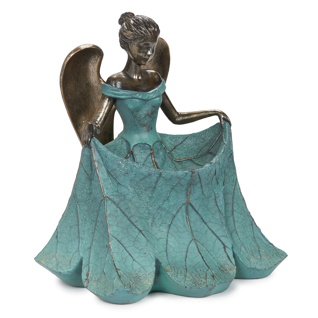 Add a touch of grace and inspiration to your outdoor space with this Angel Bird Feeder Statue. Featuring a serene angel with outstretched arms, she gently gathers her flowing dress to form a basin perfect for holding birdseed. Crafted from durable resin with a bronze-blue patina finish, this 13.25-inch tall feeder blends elegance with function, inviting feathered friends while creating a peaceful focal point for your garden, patio, or walkway. A meaningful gift for bird lovers and those who enjoy inspirational garden décor.