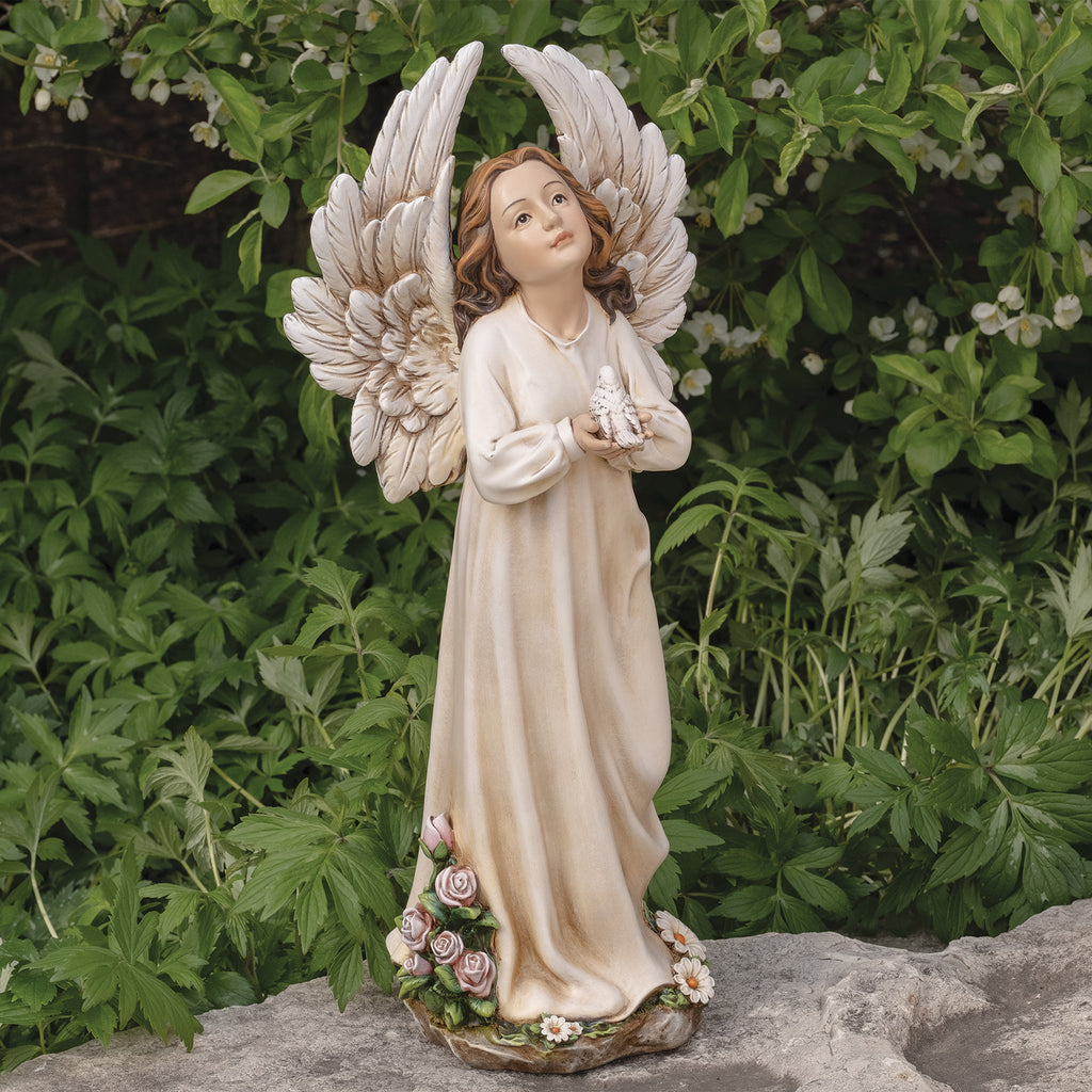 With hands gently cradling a white dove and gaze lifted skyward, this angel radiates serenity and hope. Sculpted with textured wings and flowing robes, she stands tall over a bed of sculpted daisies and roses that curl around her feet.