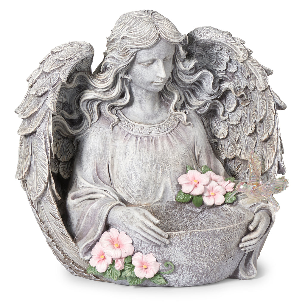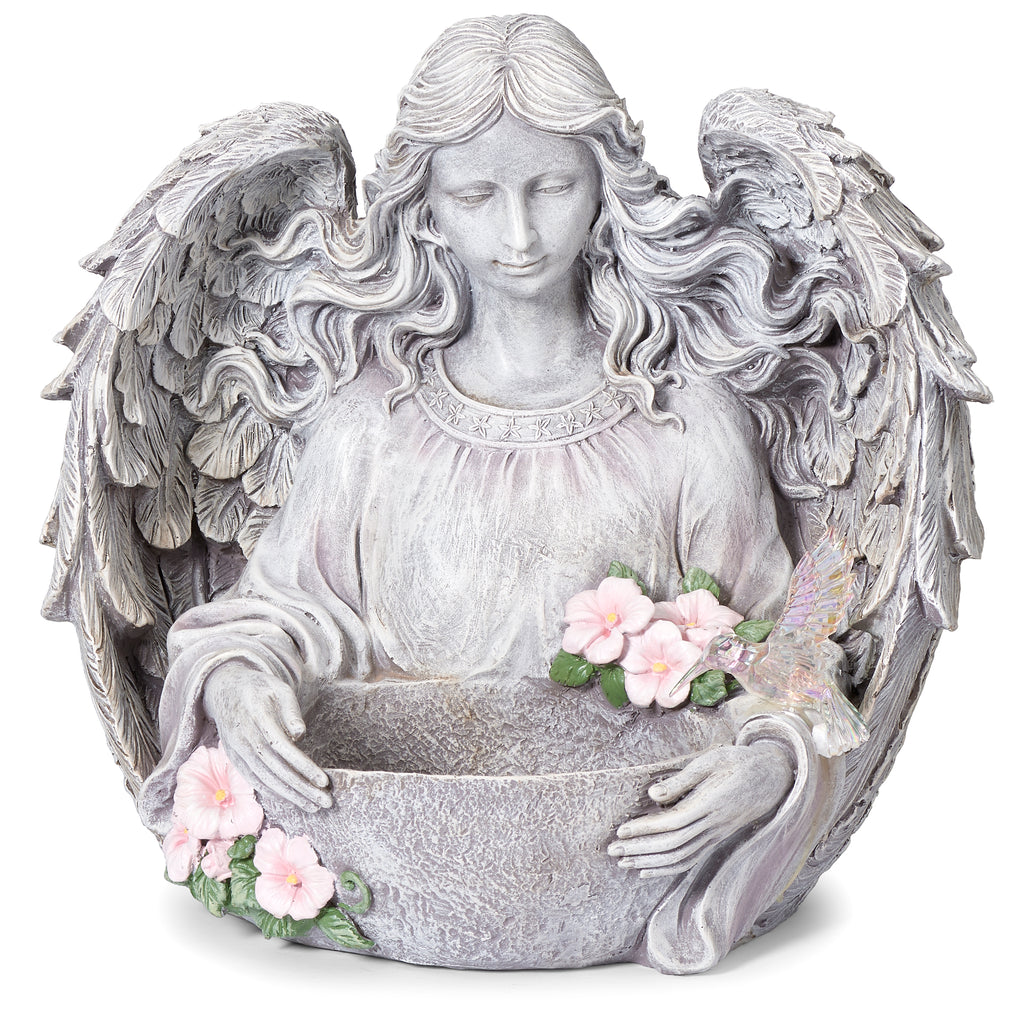 Bring peace and elegance to your home or garden with the Angel with Bowl Planter Statue. This beautifully detailed piece features a serene angel with flowing hair and graceful wings, gently holding a textured bowl that’s perfect for planting flowers or succulents. Accented with soft pink blossoms and a delicate hummingbird, it adds a touch of spiritual beauty and timeless charm to any setting. A meaningful gift or decorative accent for patios, gardens, or indoor displays.