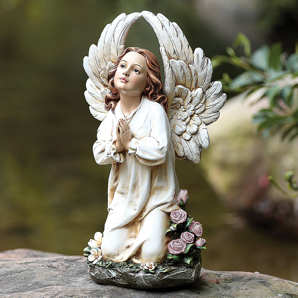 Bring peace and comfort to your outdoor sanctuary with this graceful angel statue. Kneeling in prayer, the angel is framed by detailed feathered wings and rests among blooming pink and ivory roses. Her gentle expression and soft hand-painted finish create a serene presence, making this statue a heartfelt addition to gardens, memorials, or prayer spaces.