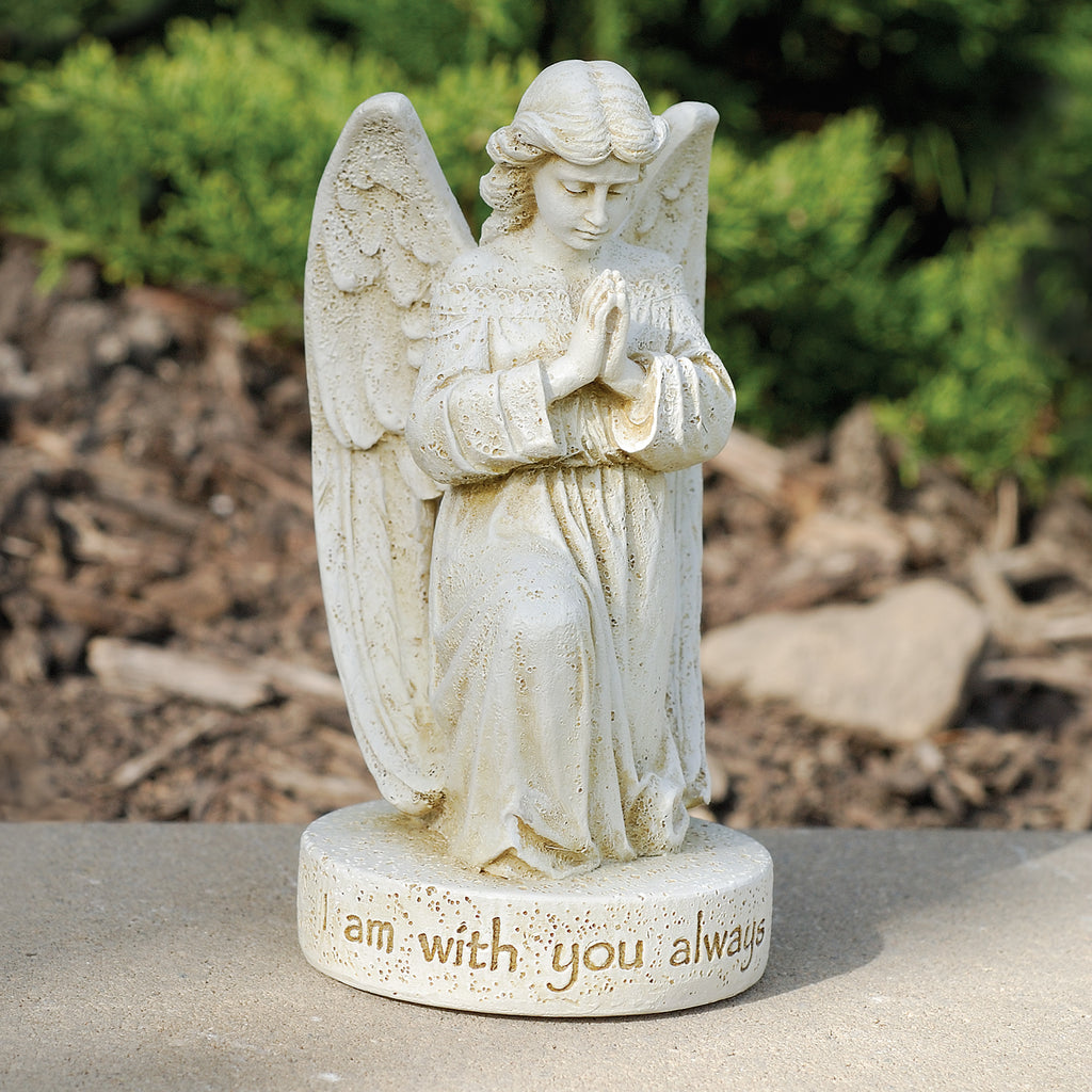 Bring comfort and serenity to your garden, home, or memorial space with this 5.5" Memorial Angel Statue. Crafted in a soft ivory stone finish, this figure features a graceful praying angel standing over a rounded base inscribed with the words "I Am With You Always"