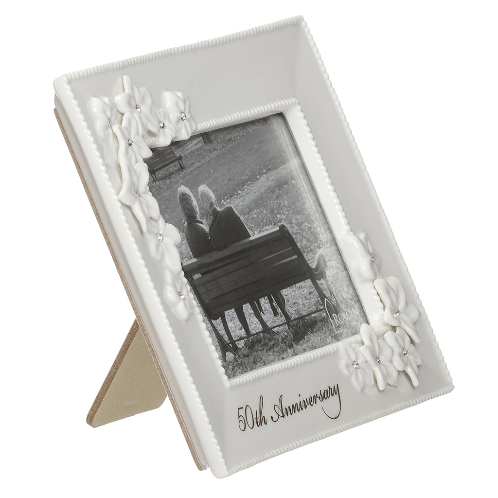 Commemorate five decades of love with the beautifully crafted Love Blooms 50th Anniversary Frame. Adorned with raised floral accents with sparkling centers and an elegant “50th Anniversary” inscription, this frame blends timeless charm with meaningful detail. A thoughtful gift or treasured display piece, it’s the perfect way to celebrate a golden milestone.