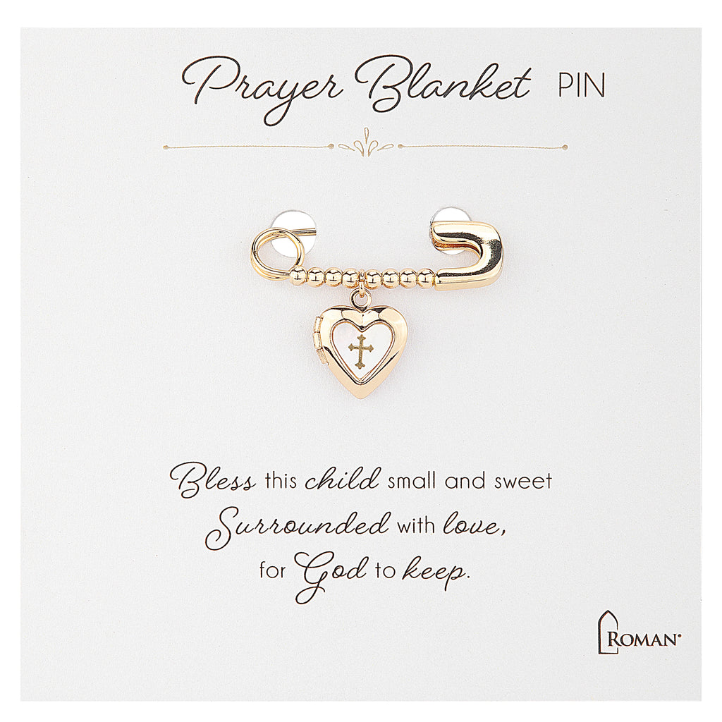 This prayer blanket pin is a meaningful keepsake designed to mark the sacred moment of baptism or christening. Featuring a delicate gold-tone safety pin accented with beaded detail, it holds a small heart charm with a cross at its center, symbolizing God’s love and protection. Its compact size makes it ideal to secure on a prayer blanket or keepsake cloth, serving as a lasting reminder of faith and blessing over a little one’s life. Presented on a card inscribed with a prayer of love and protection, it makes a heartfelt gift for parents and godparents to treasure.