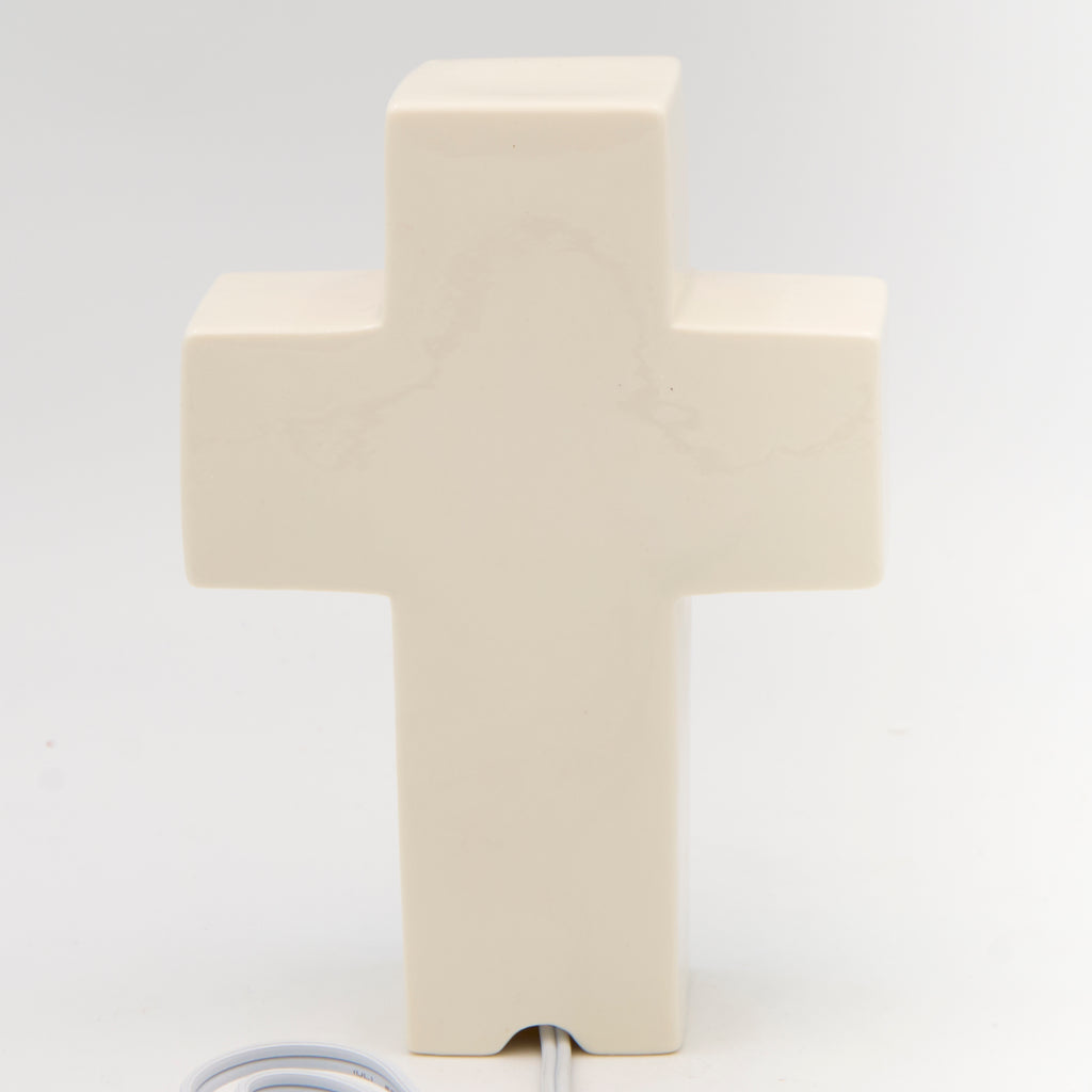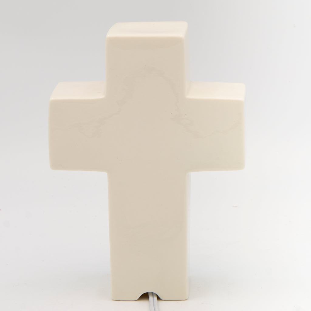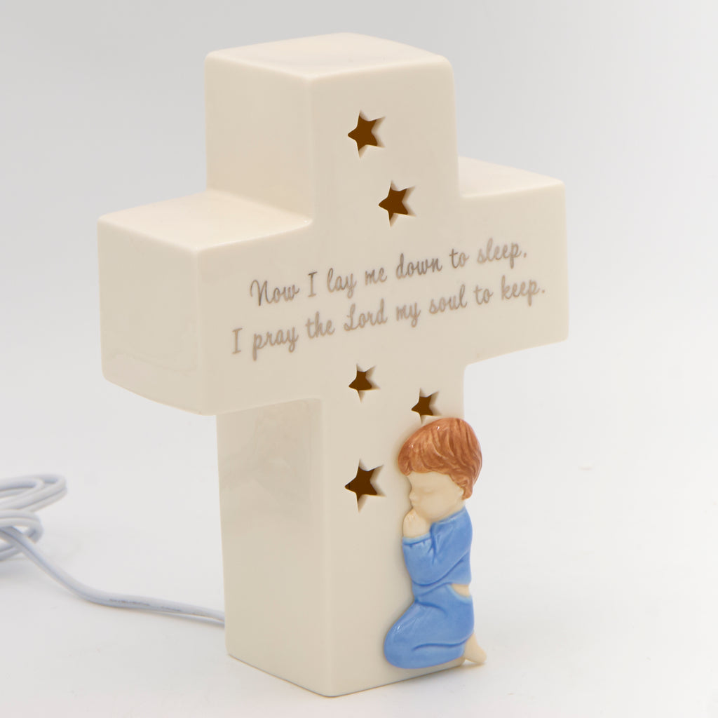 Create a peaceful bedtime routine with this elegant porcelain night-light cross from Valencia. Featuring a kneeling child and the beloved prayer “Now I lay me down to sleep, I pray the Lord my soul to keep,” it softly glows through star-shaped cutouts for a comforting nighttime light. Available in blue or pink versions, this corded electric night-light makes a meaningful gift for baptisms, nurseries, or new parents.