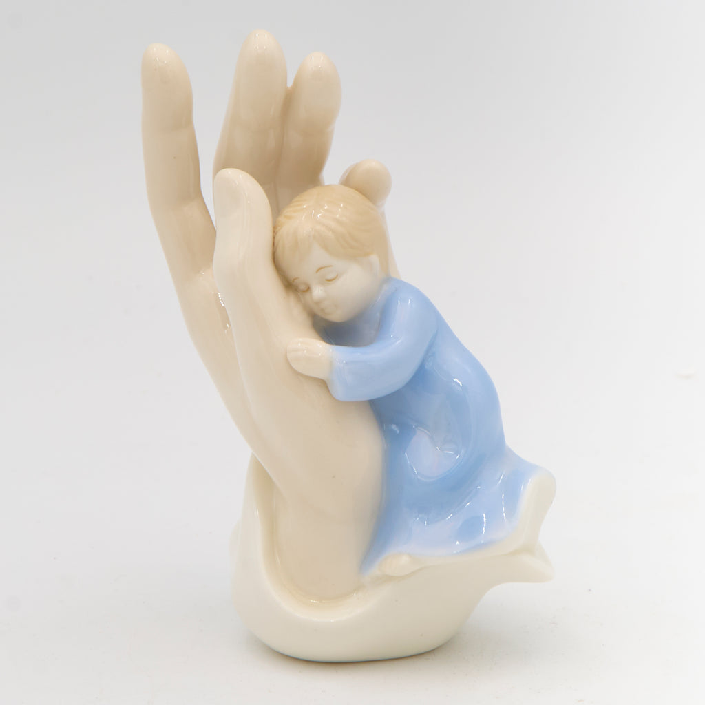 This delicate porcelain figurine captures the tender image of a child resting safely in God’s protective hand. Designed with soft detail and a glossy finish, it symbolizes divine care, love, and trust. Available in pink or blue gown variations, it makes a meaningful gift for baptisms, baby showers, memorials, or as a comforting addition to any nursery or prayer space.