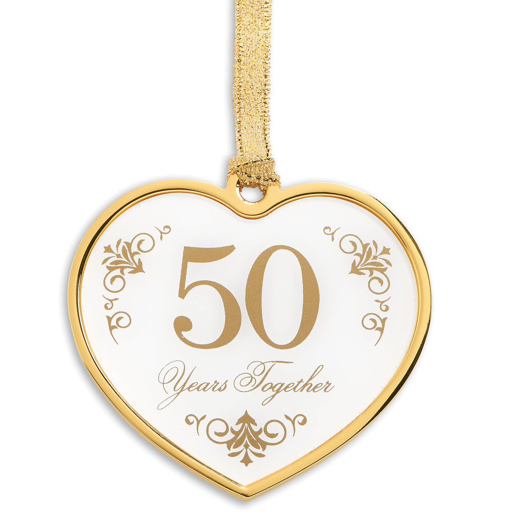 Honor five decades of love and devotion with the 50th Anniversary Ornament from the Caroline Collection. Crafted from polished metal with golden script and decorative detailing, it features the heartfelt message “50 Years Together.” Beautifully boxed for gifting, this timeless ornament is a meaningful keepsake to display year after year and a lasting tribute to a lifetime of cherished memories.