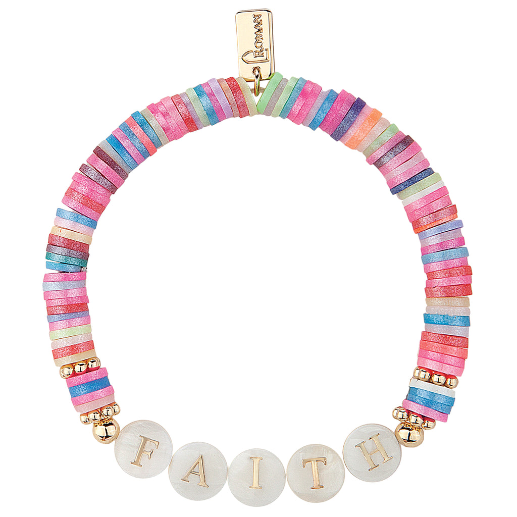Bright, playful, and full of meaning, this bracelet is designed especially for kids as a daily reminder of what matters most. Strung with vibrant heishi-style beads and finished with glossy white letter beads that spell out FAITH, LOVE, or FRIEND, it adds a joyful pop of color while carrying a deeper message. A gold-tone butterfly tag completes the look, making it a thoughtful gift of encouragement, friendship, or faith for any child.