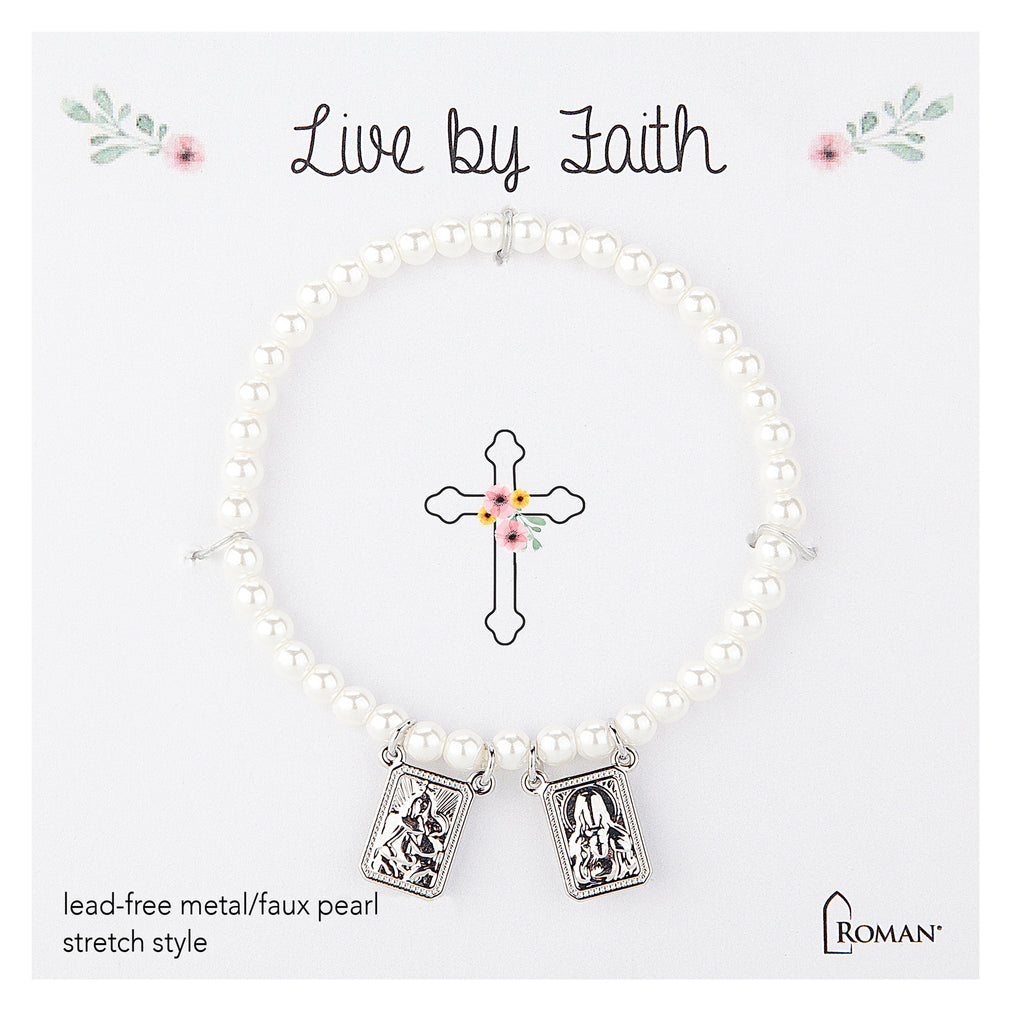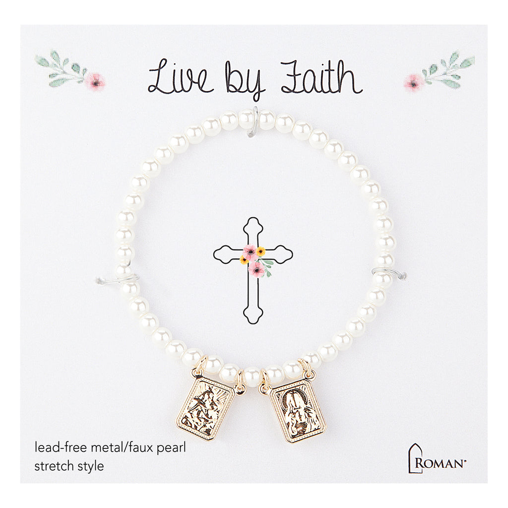 Designed for young hearts of faith, this children’s scapular bracelet features radiant faux pearls and two devotional charms, Our Lady of Mount Carmel and the Sacred Heart. Easy to slip on and comfortable for daily wear, it is available in gold or silver tone and makes a thoughtful gift for First Communion, birthdays, or everyday inspiration.