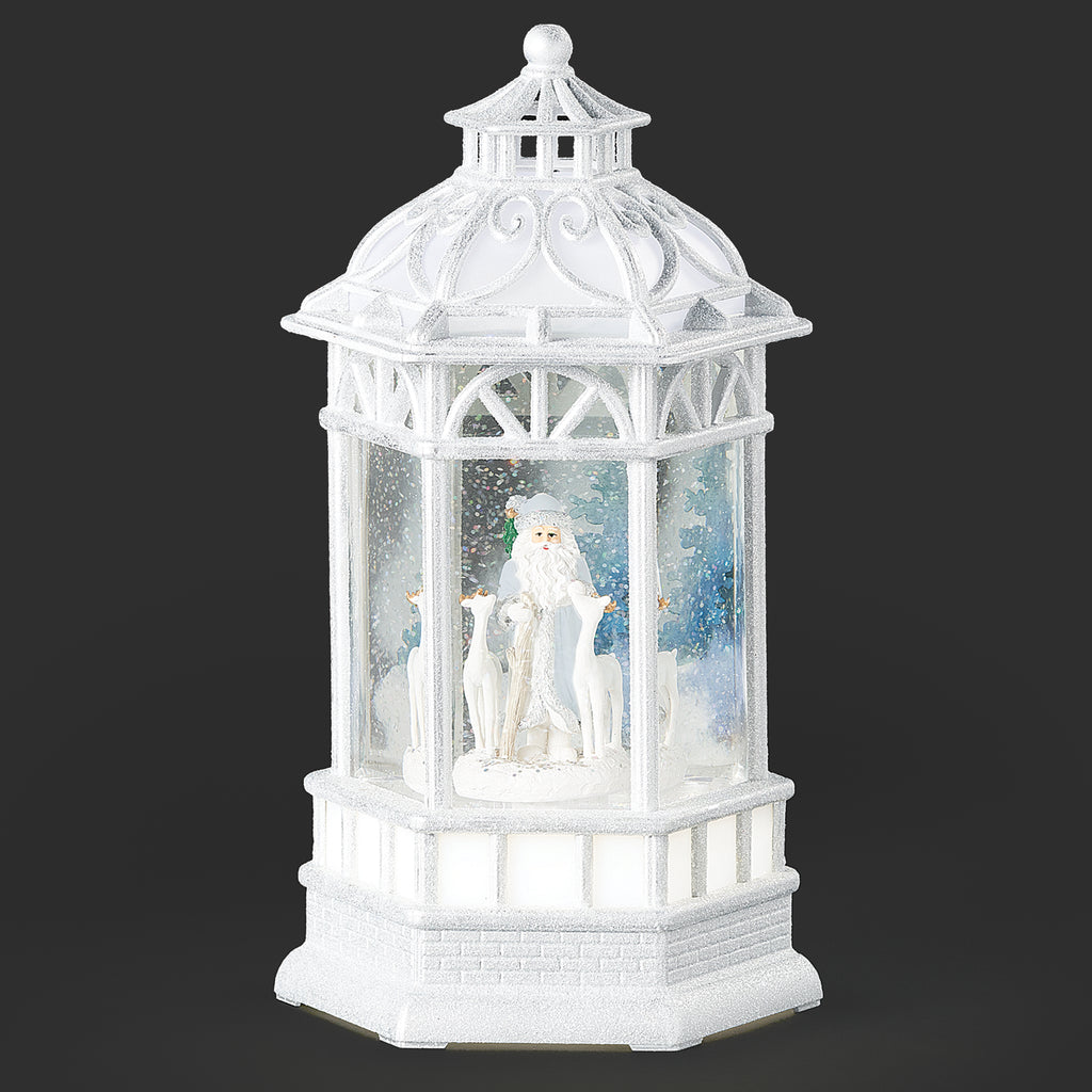 Create a charming holiday centerpiece with this festive lighted swirl gazebo. Santa stands beside a graceful deer, framed by a cheerful printed backdrop, as glitter sparkles in the glow of warm lights. A magical addition to mantels, tabletops, or seasonal displays, it captures the heartwarming spirit of Christmas.
