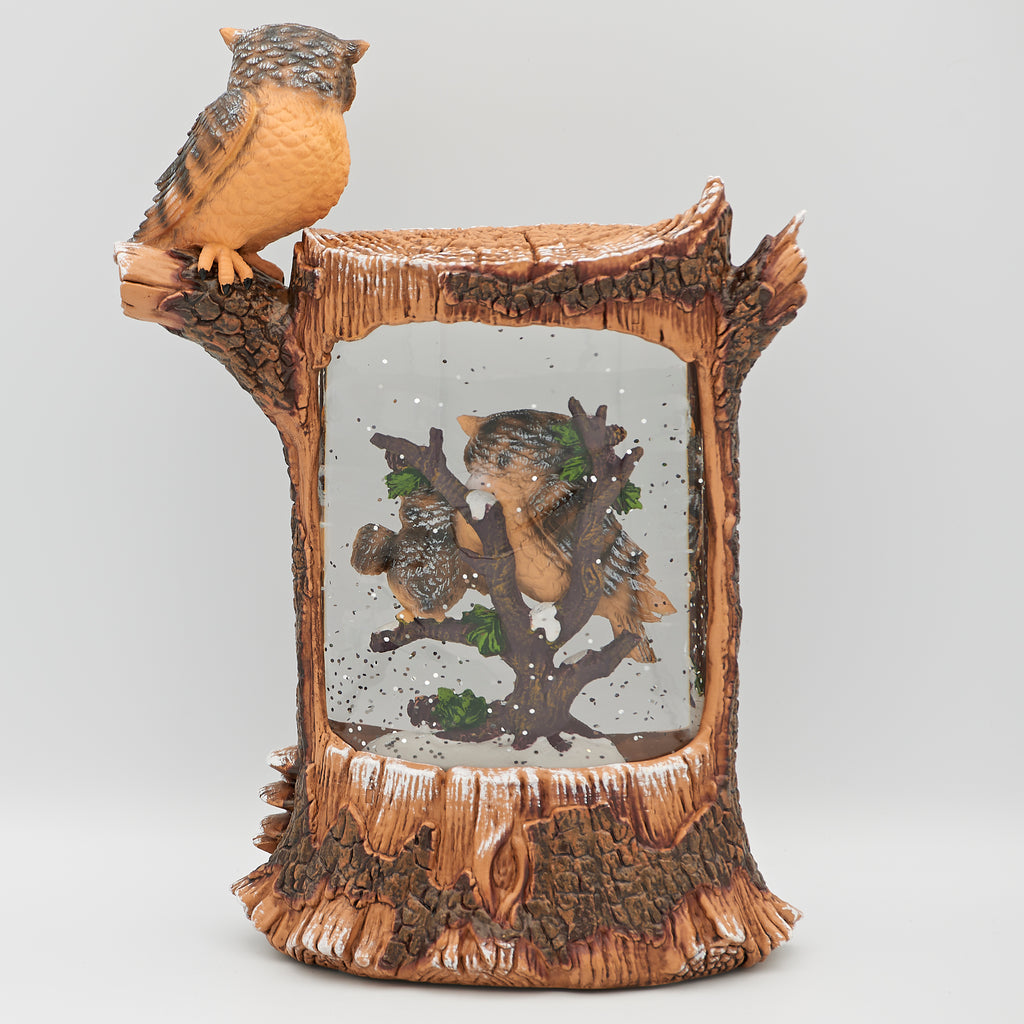 This lighted swirl log brings woodland wonder to life with a detailed owl scene nestled inside, illuminated with swirling glitter for a magical forest touch.