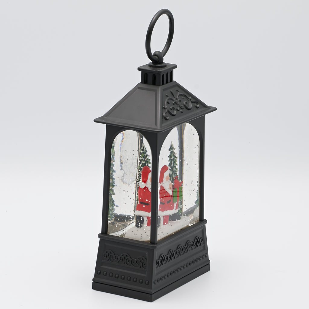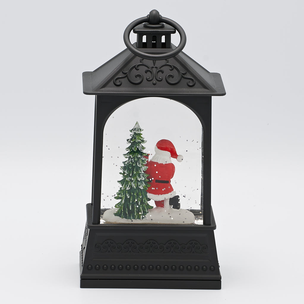 Celebrate the beauty of the season with this festive lighted swirl lantern. Inside, Santa holds a bright red cardinal, a symbol of peace and remembrance, while glitter swirls in the glow of soft light. Encased in a classic black lantern design, this piece adds warmth and charm to mantels, shelves, or seasonal displays and makes a meaningful holiday gift.