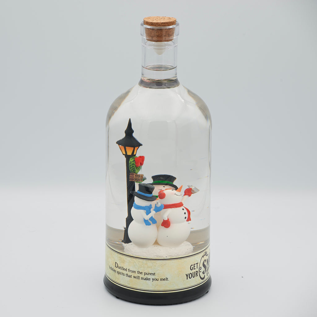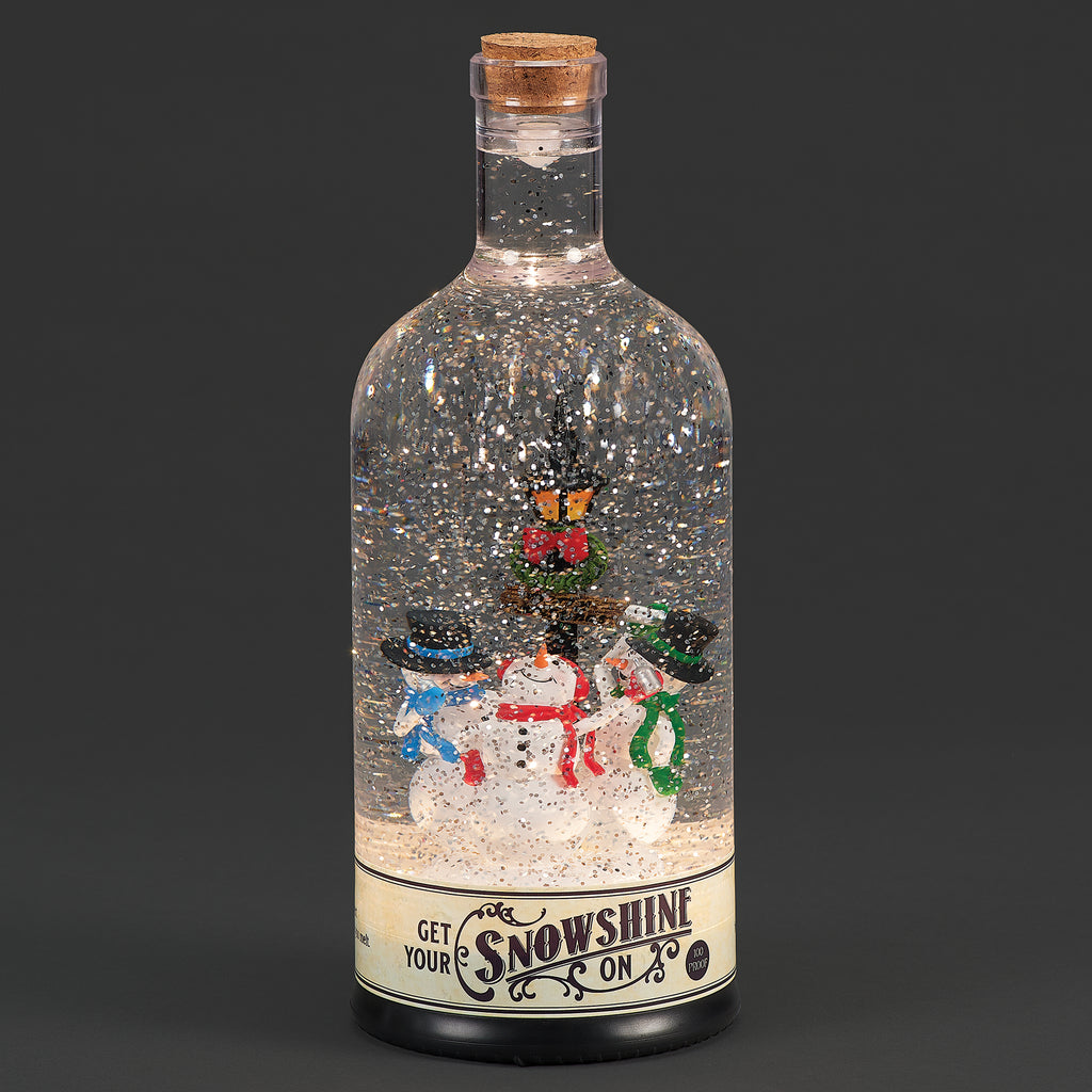 Bring humor and holiday spirit to your décor with this whimsical lighted swirl bottle. Featuring playful snowmen gathered around a festive moonshine still, it sparkles with swirling glitter illuminated by a warm glow. A fun and unique seasonal accent, it makes a standout conversation piece for mantels, shelves, or holiday displays.