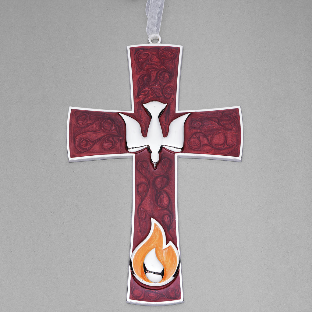 This striking Confirmation wall cross from the Caroline Collection captures the powerful symbolism of the Holy Spirit. Deep red enamel with swirling detail forms the backdrop, while a white dove descends from above, paired with a glowing flame at the base—a reminder of faith set alight through the Sacrament of Confirmation. Finished with a sheer white ribbon for easy hanging, this cross is both meaningful and visually bold, making it a lasting keepsake of a sacred milestone.