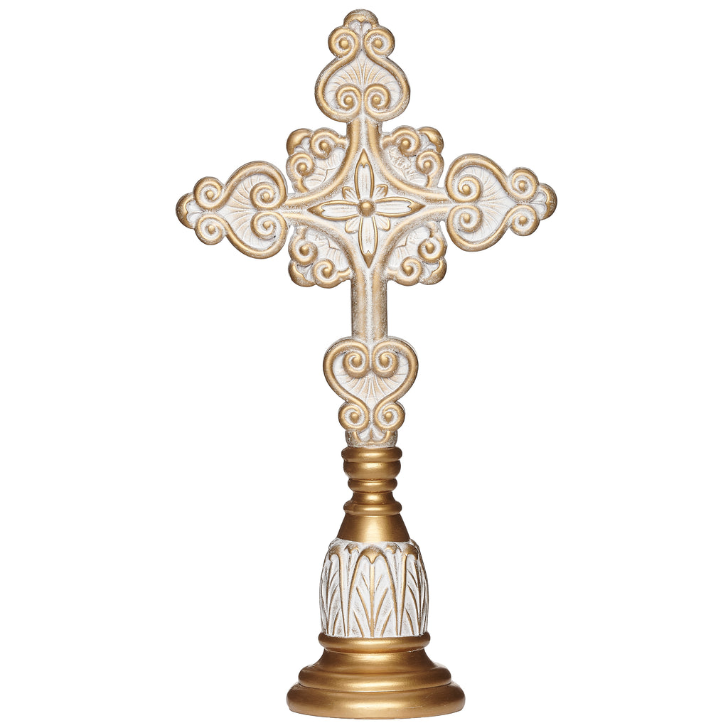 Richly finished in warm antique gold, this resin tabletop cross showcases graceful scrollwork and a small floral center, echoing classic cathedral artistry. Its delicate curves and pedestal base lend an uplifting, sacred presence to mantels, bookcases, or prayer corners. More than decor, it stands as a quiet reminder of faith's enduring strength and the hope that blooms from it.