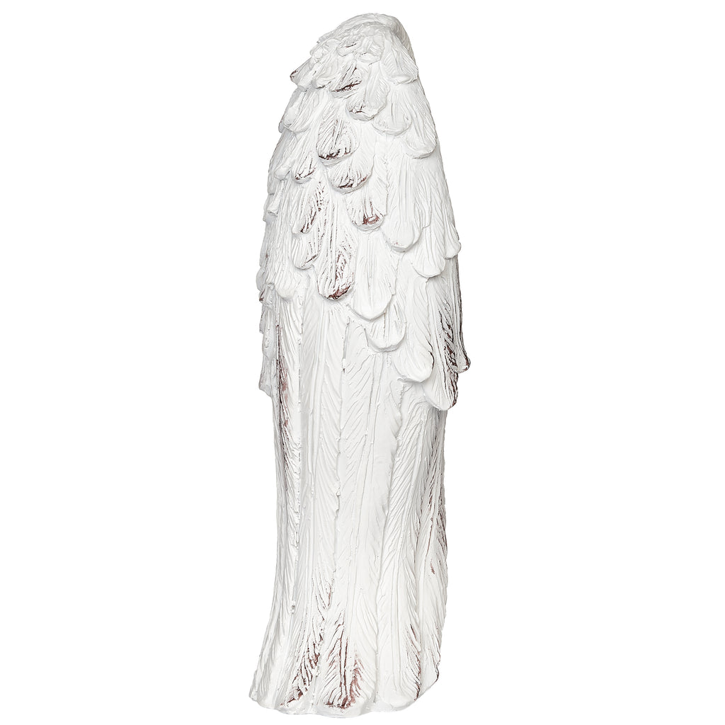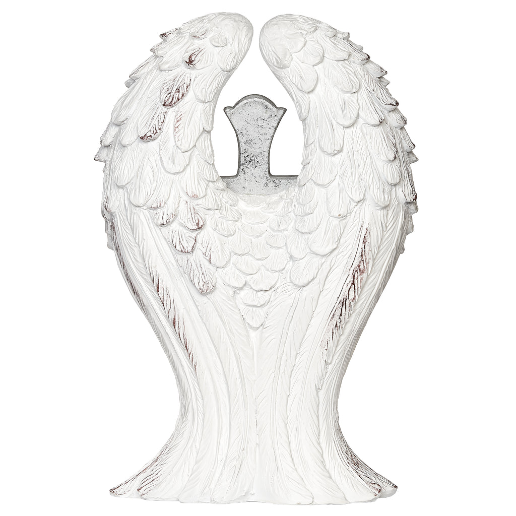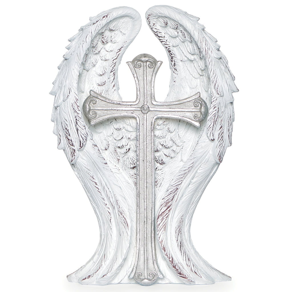 This elegant resin tabletop piece features a silver-tone cross nestled between beautifully sculpted angel wings. With its intricate feather detail and soft whitewashed finish, it brings a peaceful and sacred presence to any room. A symbol of faith, comfort, and divine protection‚ perfect for mantels, shelves, or as a heartfelt gift for a loved one.