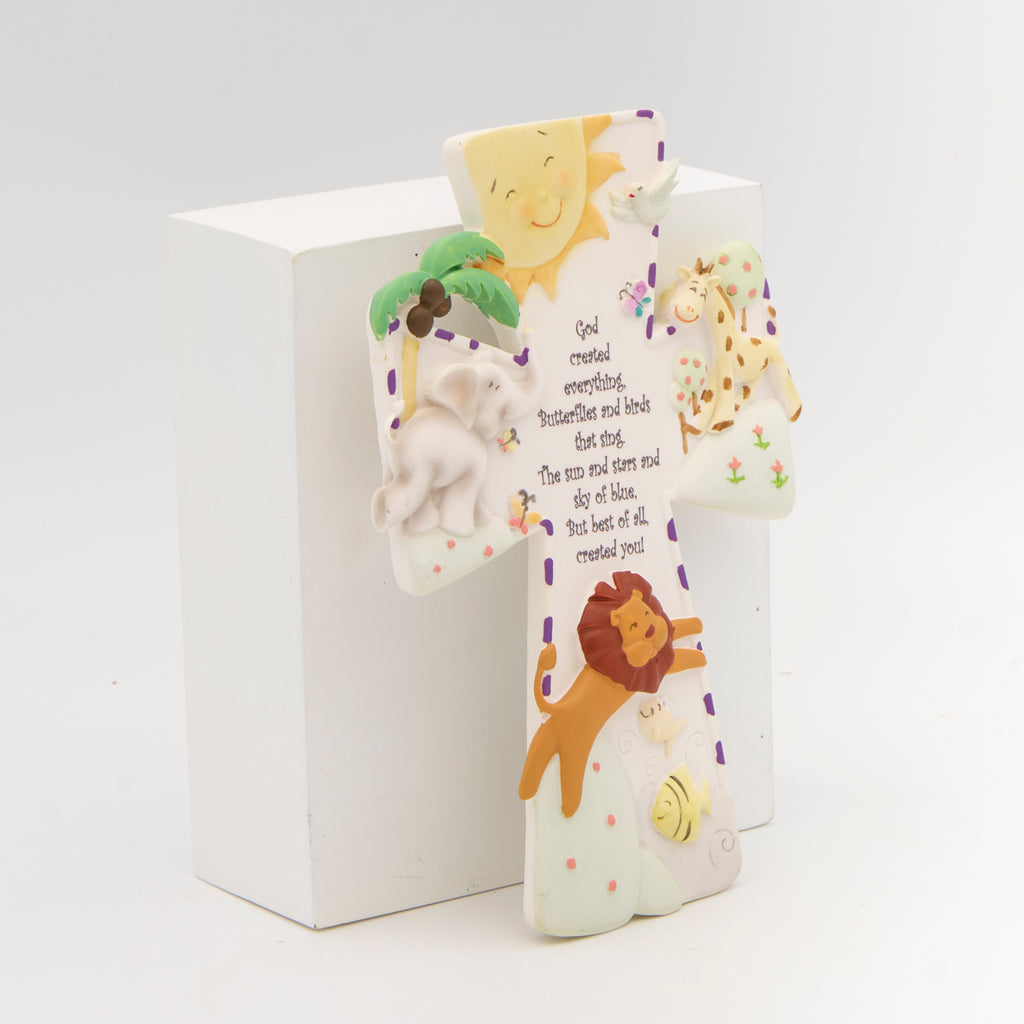 Designed with cheerful animals, bright colors, and playful textures, this wall cross brings a joyful message of God’s love and creation to life. The raised details, smiling sun, and whimsical accents make it a perfect addition to a child’s room or nursery. Featuring the heartwarming words, “But best of all, created you!” it serves as a daily reminder of faith, joy, and the wonder of God’s world.