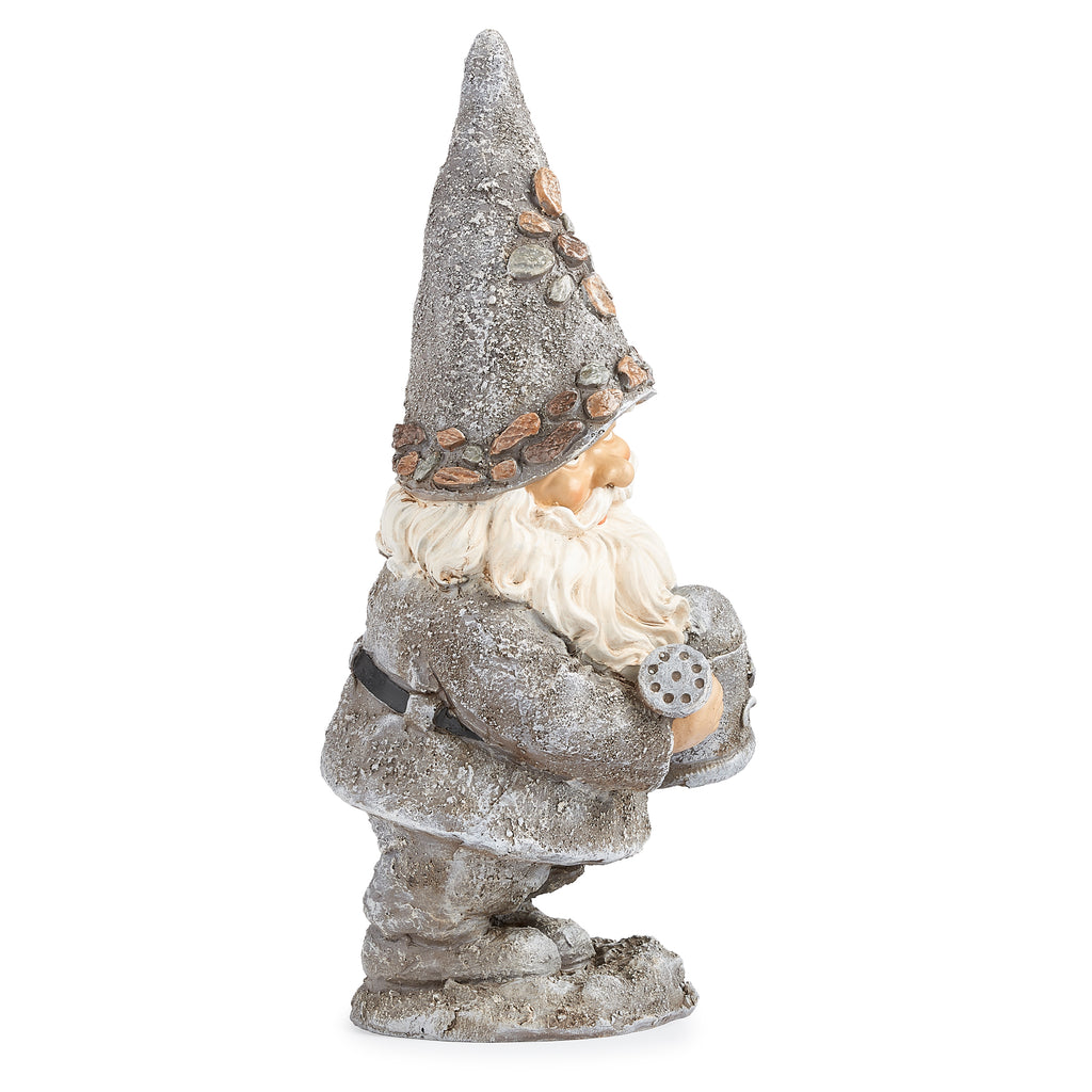 Bring a touch of woodland magic to your garden with the Stone-Look Gnome with Watering Can Statue. Designed with a textured, weathered stone appearance, this endearing gnome carries a heart-embellished watering can, symbolizing care and nurture. Decorative pebbles crown his tall hat, adding a natural, handcrafted feel that makes him a delightful accent for flower beds, patios, or as a thoughtful gift for garden lovers.