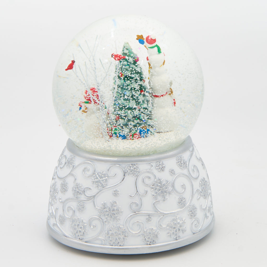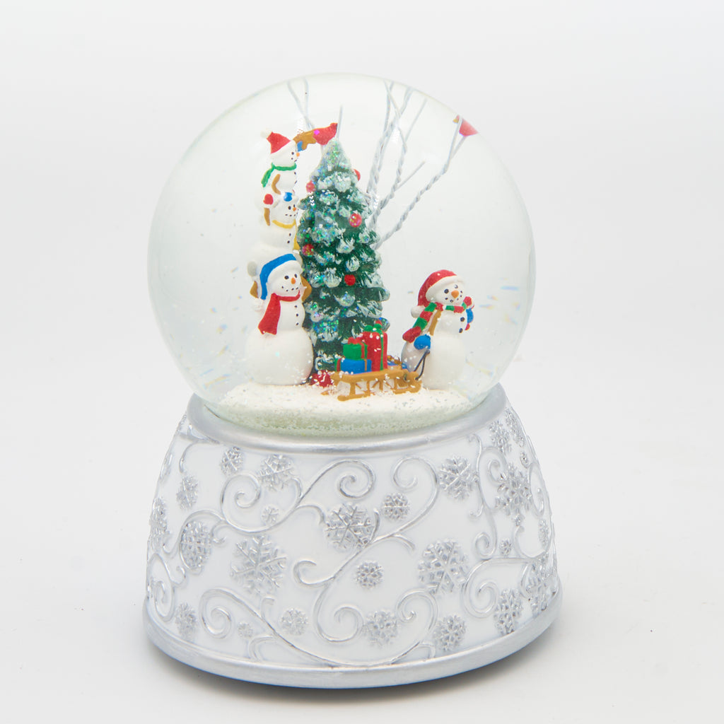 This festive dome depicts playful snowmen busily decorating a Christmas tree, capturing the cheerful spirit of the season. This charming piece adds a joyful and whimsical touch to your holiday décor, perfect for creating a warm and festive atmosphere in any space.