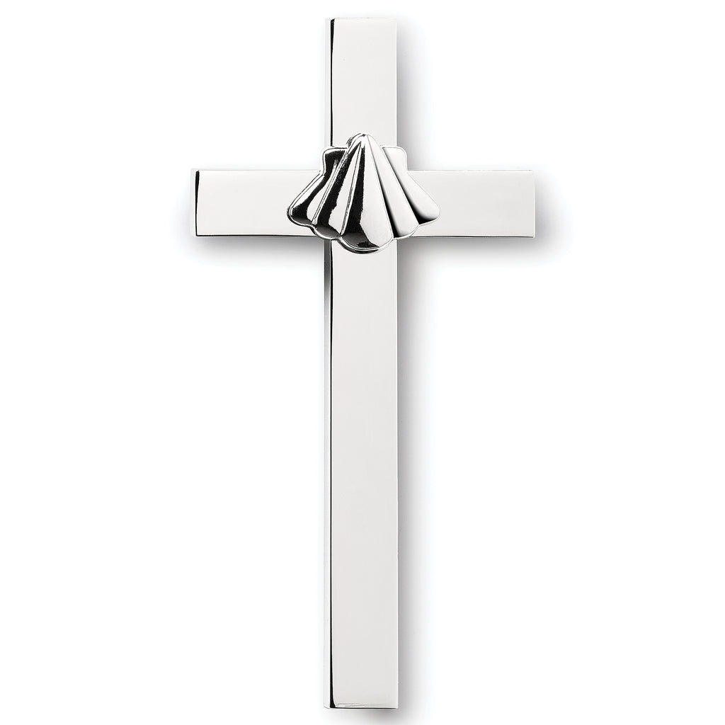 This Baptism Cross from the Caroline Collection shines with simple elegance, crafted in polished silver metal with a raised shell accent that symbolizes the sacred waters of baptism. Its clean lines and reflective finish create a timeless look, while the shell detail adds a meaningful touch of tradition. Designed as a lasting keepsake, this cross serves as both a symbol of faith and a beautiful reminder of a child’s baptism day.