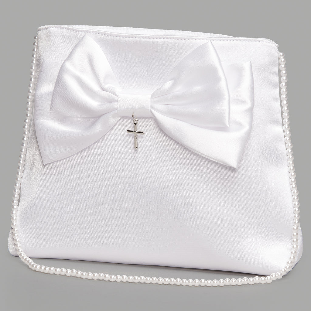 This First Communion purse is a graceful accessory designed to complement her sacred day. The smooth white fabric is adorned with a satin bow and delicate cross charm, while a strand of pearls forms the handle for a classic touch. Both beautiful and practical, it offers space to carry small keepsakes or essentials while completing her Communion look with elegance. A lasting reminder of the day, this purse makes a thoughtful gift and a cherished part of her celebration.