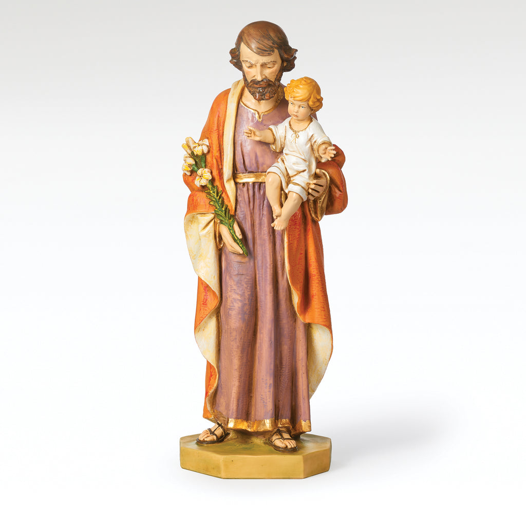 Saint Joseph, the protector of the Holy Family and patron of the universal Church, is beautifully honored in this figure. Depicted holding the Child Jesus in one arm and a flowering staff in the other, Joseph is shown as both guardian and guide, embodying strength, humility, and devotion.