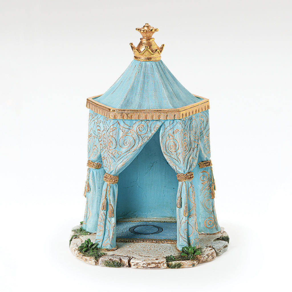 This striking tent enhances your nativity display with its soft blue drapery detailed in golden scrollwork, crowned with a regal finial. Representing the dwelling of one of the Magi, it reflects both honor and majesty as the Wise Men journey to adore the newborn King. Its ornate design and vivid color bring a sense of richness and storytelling depth to your Fontanini village.