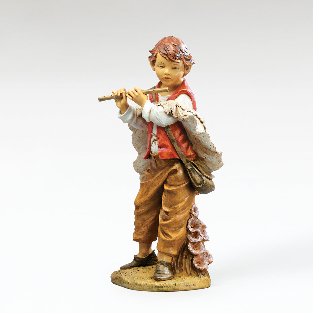 This statue of Michael captures the charm of a young musician offering his gift of song to the Nativity. He stands with flute in hand, dressed in golden trousers and a red vest layered with a rustic shawl, a small satchel at his side. His expression is thoughtful and sincere, evoking the spirit of devotion and youthful artistry. A figure that brings both energy and innocence, Michael is a meaningful addition to larger home or church displays.