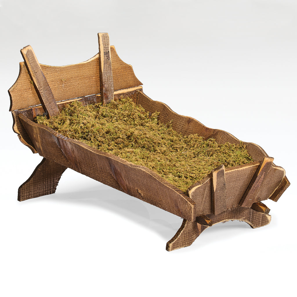 Crafted to complement this wooden manger is built with a rich brown finish and with natural moss. Its sturdy arched construction provides a traditional cradle for displaying the centerpiece of your nativity.