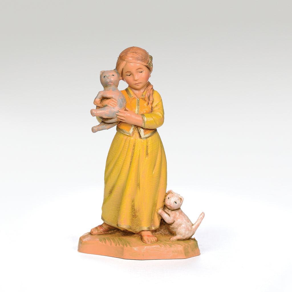 Filia shows a young girl holding her cat Shalom, while another kitten plays at her feet. She is dressed in warm harvest tones, her expression sculpted with lifelike detail. Guided by the instincts of her cat, Filia’s story tells of a simple encounter on the road to Bethlehem, where her kindness offered help to a weary couple. This figure brings a personal touch to the Nativity, reminding us how even the smallest gestures can carry lasting meaning.