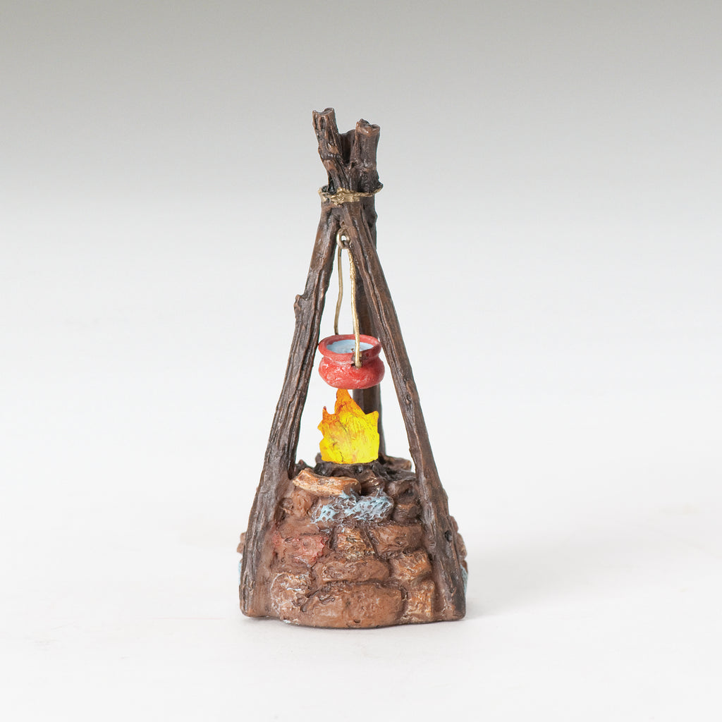 This Fontanini Campfire accessory adds light, realism, and cozy detail to your nativity village. Featuring a glowing flame beneath a hanging clay pot and rustic tripod frame, it’s perfect for shepherd or villager scenes and creates a warm, lived-in atmosphere both day and night.