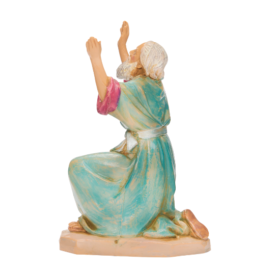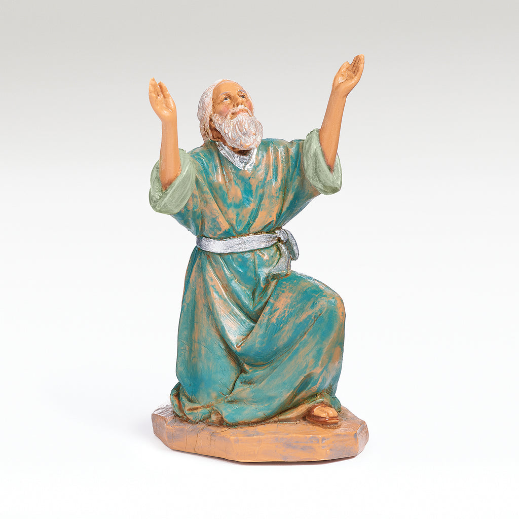 Simeon the Prophet is shown kneeling with arms lifted, his face turned upward in reverence. Dressed in a flowing turquoise robe with a silver belt and deep rose cuffs, this figure reflects the moment he recognized the long-awaited Savior. After a lifetime of faithful service and waiting, Simeon lifted his voice in praise, his hope fulfilled in the presence of the Christ Child.