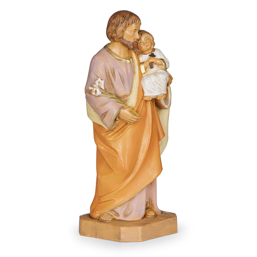 This Saint Joseph figure beautifully honors the guardian and protector of the Holy Family. Depicted with the Child Jesus in one arm and a lily in the other, Joseph is shown with a calm, fatherly presence that reflects both love and responsibility. His expression and posture convey trust in God’s plan and the devotion of a father chosen to guide and protect. A meaningful reminder of faith and family, this piece makes a treasured addition to prayer spaces and religious collections,