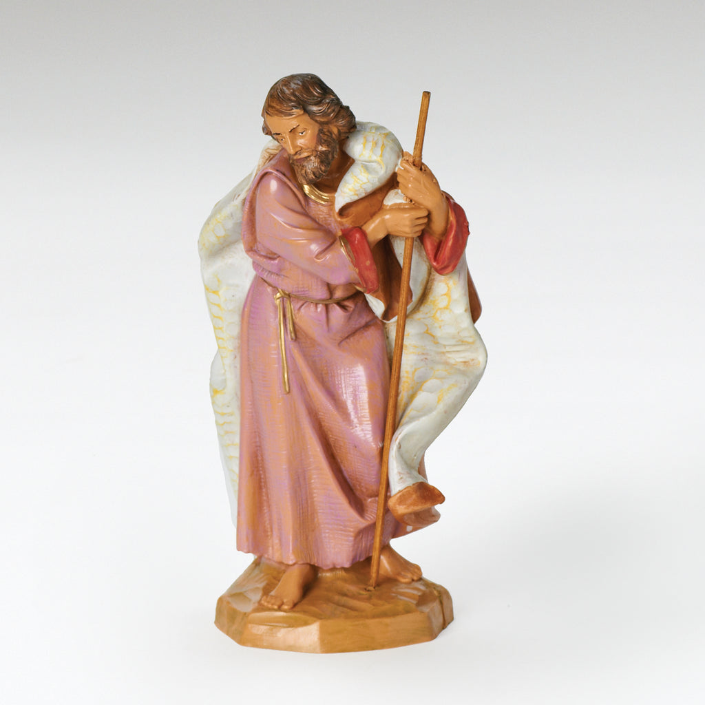 Joseph is shown with a staff in hand and a lamb carried across his shoulders, his rose-colored robe tied with a rope belt and draped with a white cloak lined in gold. More than just Mary’s husband, Joseph was chosen to guide and protect the Holy Family, faithfully leading them on the road to Bethlehem and standing watch beside the manger. This figure honors his essential role in the Christmas story and brings strength and meaning to your Nativity display.