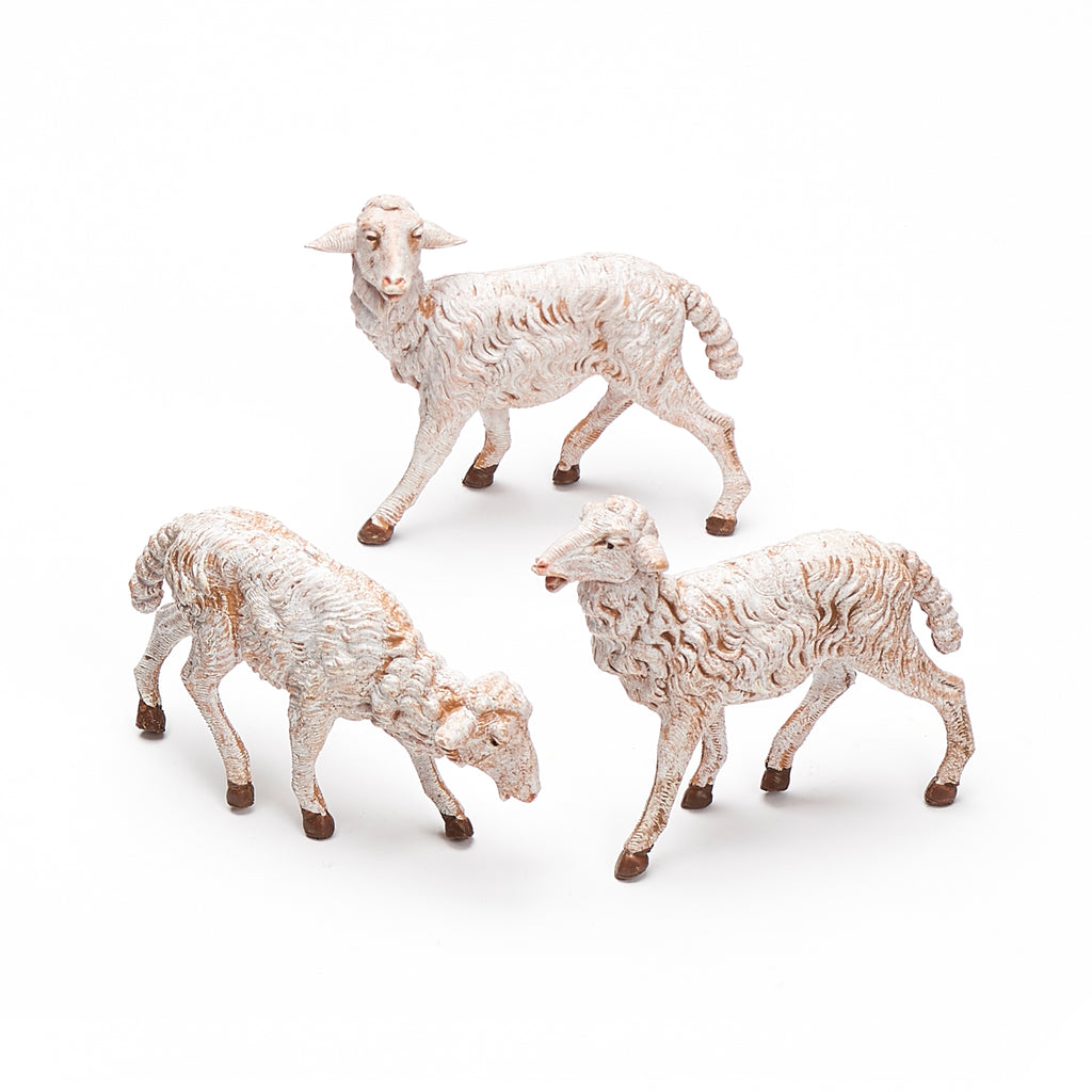 This White Sheep 3-PC Set includes three individually posed sheep, each sculpted in mid-motion to add energy and realism to your nativity village. Their textured white coats, accented with soft brown shading, highlight the lifelike detail in every fold of wool. With open mouths and perked ears, these sheep bring a sense of alert presence, making them a natural complement to shepherd figures.