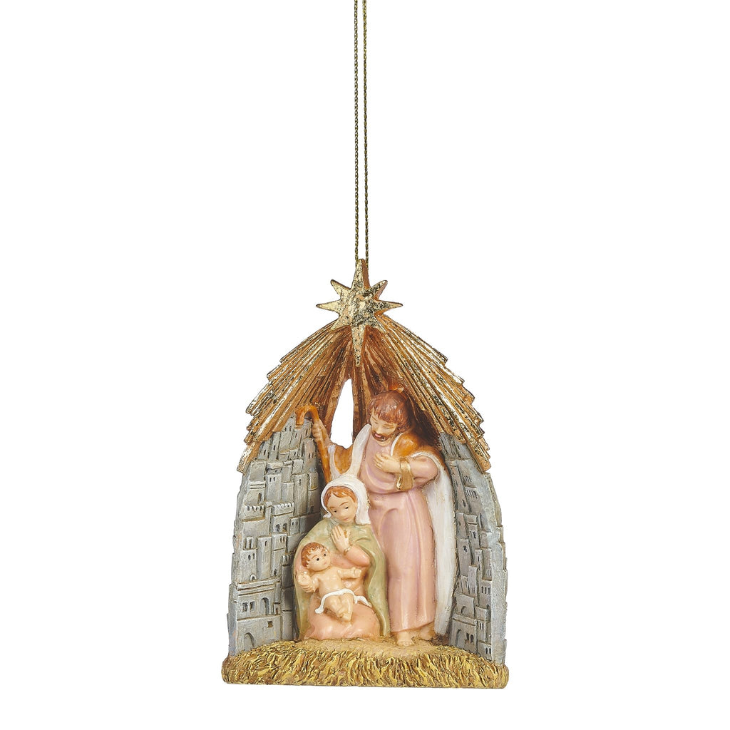Add sacred elegance to your holiday decor with this finely detailed ornament featuring Mary, Joseph, and the Infant Jesus in a rustic Bethlehem setting beneath a shining star. Perfect for the tree or as a heartfelt keepsake, it brings warmth, faith, and festive beauty to your collection.