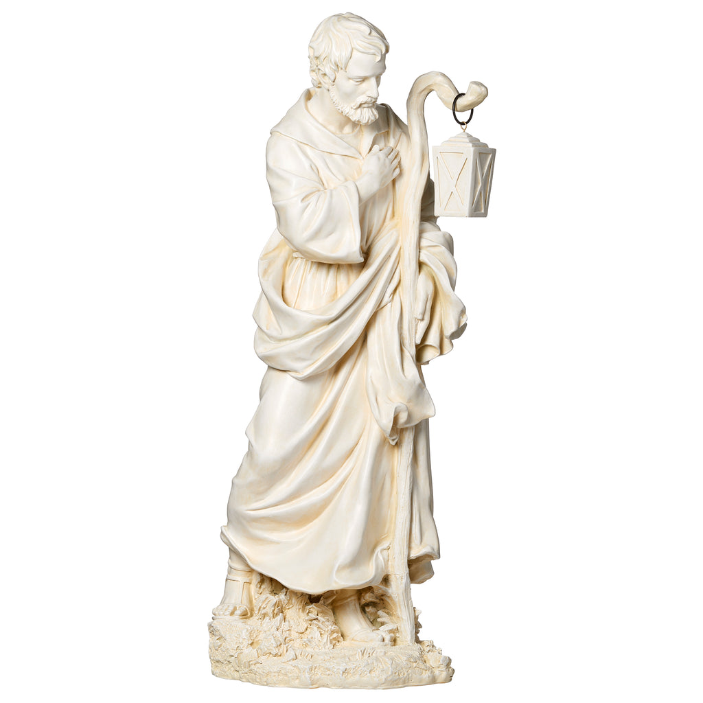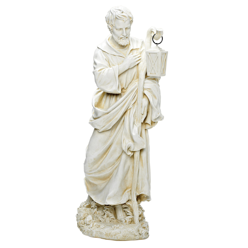 This elegant St. Joseph figure from Joseph’s Studio captures the protector of the Holy Family in serene devotion. Clad in flowing ivory robes, St. Joseph holds a lantern close to his heart, symbolizing guidance, faith, and divine light. The statue’s graceful contours and intricate detailing give it a timeless presence, evoking reverence and peace. Designed for outdoor display, it serves as a striking centerpiece in a garden nativity or as a year-round symbol of steadfast care and humility.