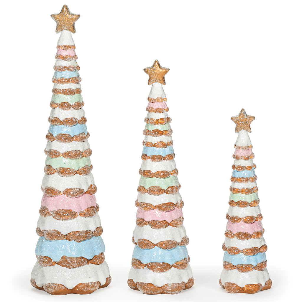 Add a sweet and whimsical touch to your holiday décor with this frosted gingerbread tree set. Decorated in pastel colors with glittering accents and topped with golden stars, these festive trees bring a charming sparkle to any space. Perfect for tabletops, mantels, or village displays, this set of three makes a delightful addition to your seasonal collection.