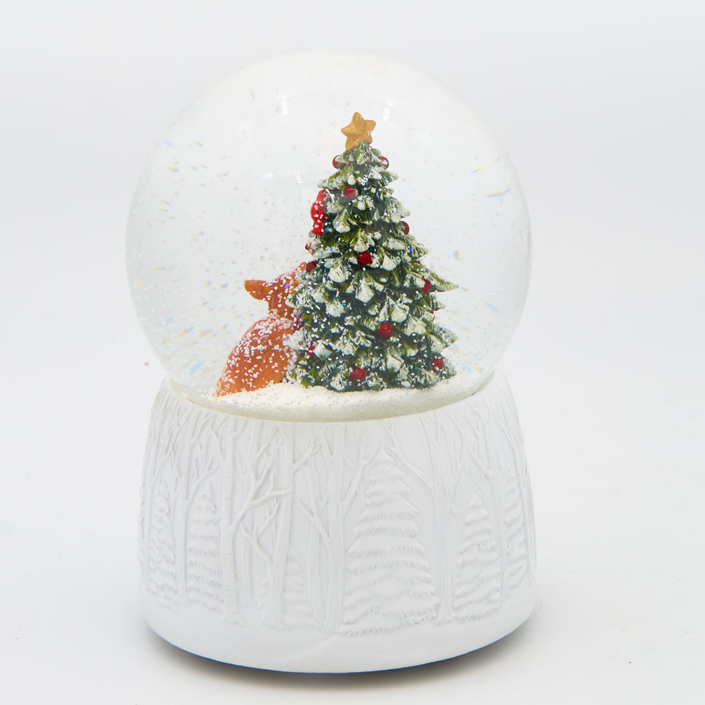 This enchanting snow globe captures a heartwarming woodland scene with a gentle doe and her fawn resting beside a beautifully decorated Christmas tree. With snow drifts softly around them, it creates a serene winter wonderland. A perfect accent to bring peace and festive charm to your holiday décor.