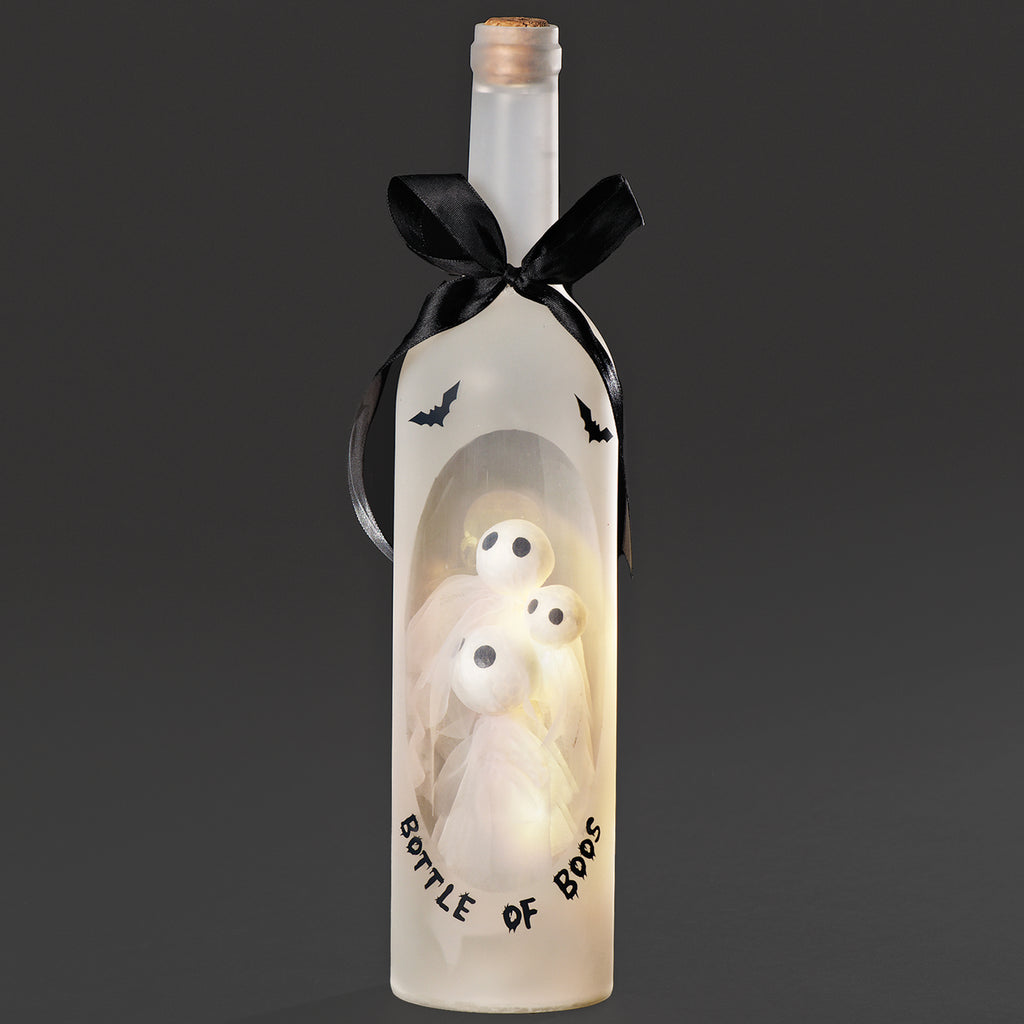 Add playful fright to your Halloween décor with this lighted Bottle of Boos. Inside, three glowing ghosts peek out with wide-eyed charm, accented by bats and a black ribbon bow for extra spooky flair. Perfect for bar carts, shelves, mantels, or party tables, it brings a fun mix of eerie and whimsical to your seasonal display.