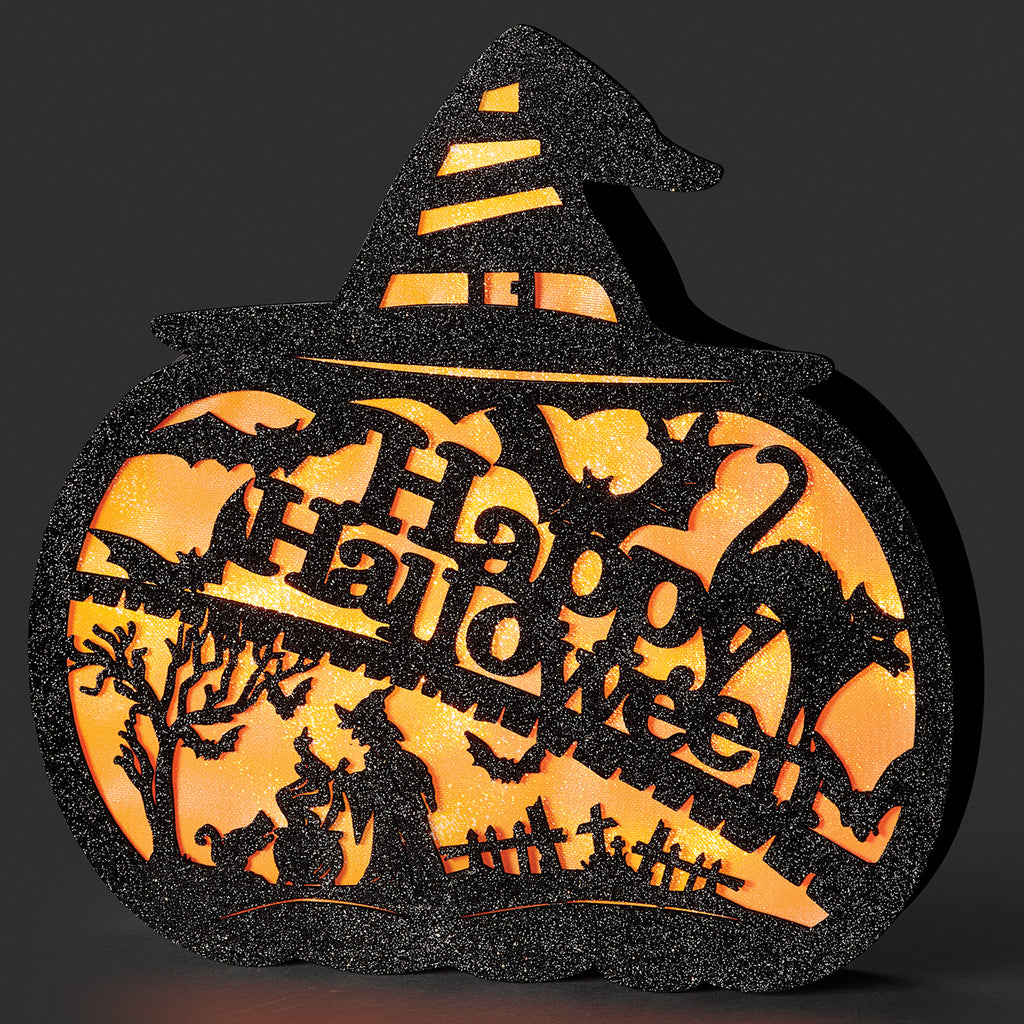 Celebrate the spooky season with this lighted pumpkin decoration. Crafted from MDF, it features a glowing “Happy Halloween” message surrounded by silhouettes of witches, bats, and cats for a classic haunted look. Battery-operated for easy placement, it’s a fun and festive accent for mantels, entryways, or tabletops.