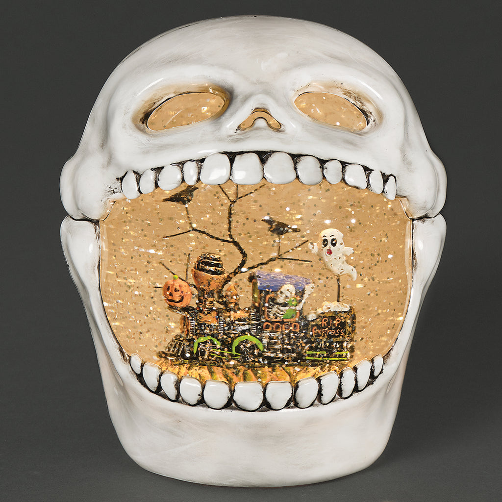 Add spine-chilling charm to your Halloween décor with this lighted skull-form swirl lantern. Inside the open mouth, a haunted train glides through a spooky graveyard scene, complete with ghosts, bats, and pumpkins. Swirling glitter enhances the eerie effect. A bold and unforgettable accent for haunted houses, mantels, or Halloween party décor.