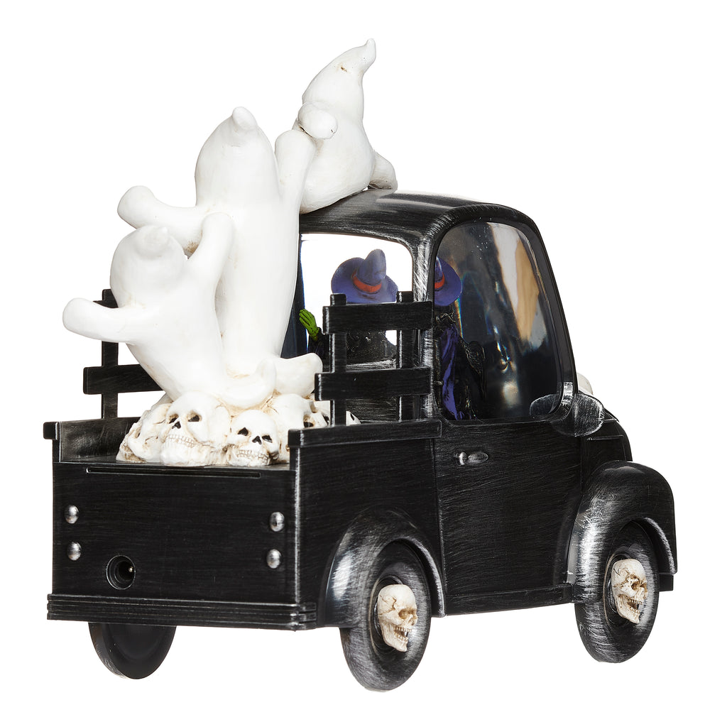 This lighted Halloween truck is full of whimsical charm! Glitter swirls around a witch at the wheel while cheerful ghosts ride along in the back. It brings a playful glowing touch to mantels, shelves, or Halloween party displays.