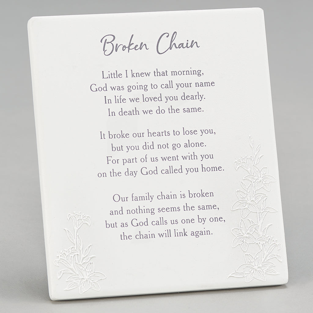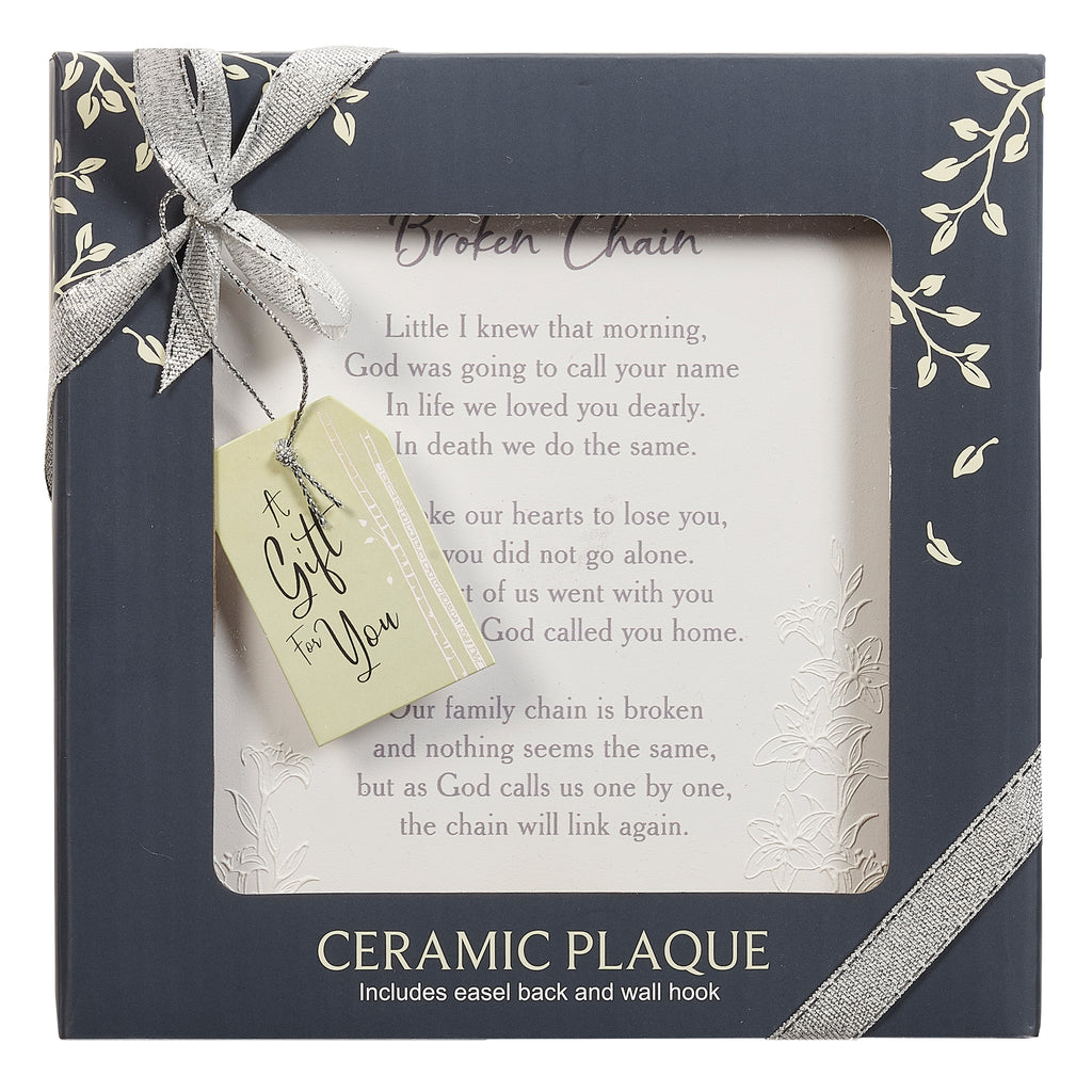 The God Called You Home Memorial Wall Plaque is a meaningful way to honor the memory of a loved one. Featuring the comforting “Broken Chain” verse and delicate floral accents, this plaque is crafted from durable resin with the look of fine ceramic. Designed with both a wall hanger and a built-in easel, it offers versatile display options for memorial corners, desks, or bedside tables. Beautifully boxed, it’s also ready to give as a heartfelt sympathy gift.